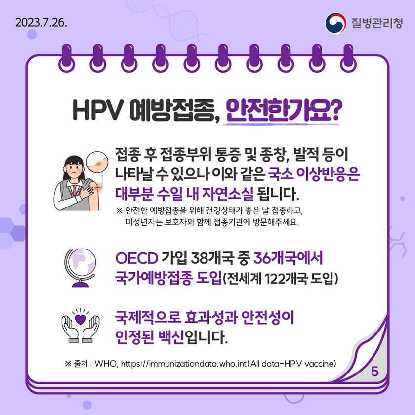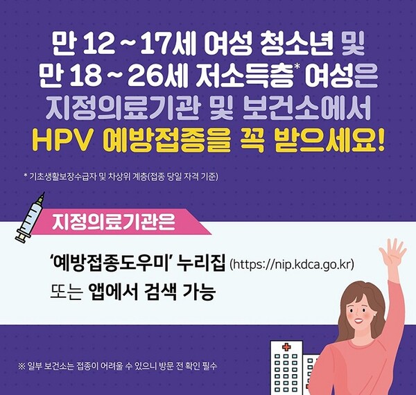 질병관리청은 사람유두종바이러스(Human Papillomavirus, 이하 HPV) 감염증 예방을 위해, 국가 예방접종 지원 대상자에게 겨울방학을 활용하여 예방접종을 받기를 당부하였습니다.