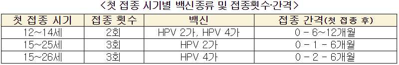 ▶ HPV 첫 접종 시기별 백신 종류 및 접종 횟수 · 간격