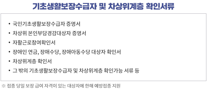 - 법적 근거 : '국민 기초생활 보장법'에 의한 기초생활보장수급자 및 차상위계층(접종 당일 기준)